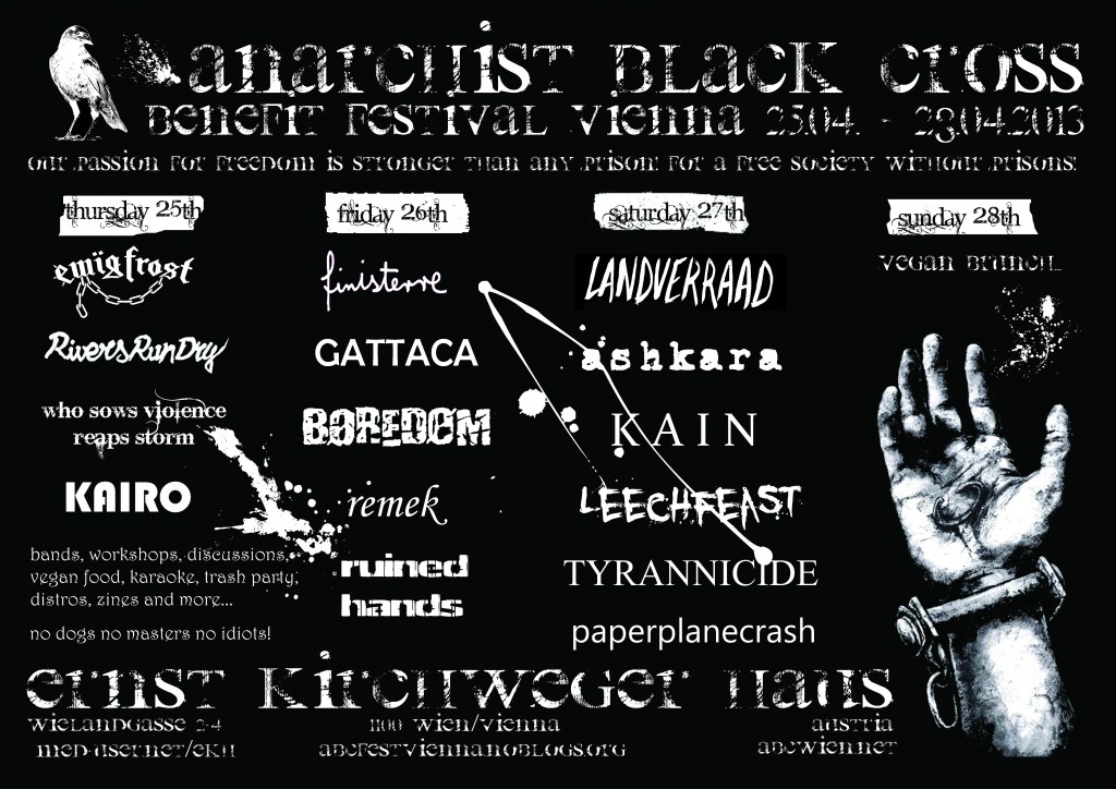 Um es auf den Kern der Sache herunter zu brechen: Wir brauchen Geld. Klar ist es ein leidiges Thema, aber eben eine Notwendigkeit. Um Genoss_Innen, die im Knast sitzen, oder mit anderen Formen von Repression konfrontiert sind, zu unterstützen, um Broschüren, Plakate und andere Materialien zu finanzieren, etc… Deshalb liegt der Schwerpunkt des Festivals eben nicht auf einer Vielzahl von inhaltlichen Auseinandersetzungen und Diskussionen, sondern auf Konzerten und einer großen Soliparty. Was bedeutet dass von Donnerstag bis Samstag insgesamt 14 Bands spielen werden. Bezüglich des Essens werden wir von der ‘Kochgruppe F.U.G.’ unterstützt. Dennoch denken wir, dass neben dem ganzen ‘Partyspektakel’ auch noch genügend Raum sein wird um Kontakte zu knüpfen und Infos und Materialien auszutauschen. Jeden Tag werden vor den Konzerten Diskussionen, Vorträge und Workshops stattfinden. Und zwar in dem Rahmen, der uns organisatorisch möglich war. Am Donnerstag wird es eine Veranstaltung mit einer Person geben, die in den 80ern und 90ern im Arbeitskreis Schwarzau organisiert war. Am Freitag folgt ein Workshop zum Thema Psychiatrie, der Aufgrund seiner Länge und Intensität bereits am Nachmittag beginnen wird. Danach wird es einen Workshop zum Thema Plakatieren geben. Für Samstag haben wir drei Veranstaltungen eingeplant. Die erste wird sich mit dem im Bau befindlichen Schubhaftzentrum Vordernberg in der Steiermark beschäftigen. Die zweite dreht sich um die Repression der letzten Jahre, und der Arbeit die damit einherging, in diesem Zusammenhang werden die Entwicklungen seit 2008 analysiert. Die dritte Veranstaltung soll etwas offener werden. Nach einer kurzen Einführung wird zu einer Diskussion übergegangen werden. Das Thema soll uns zu einer Debatte über uns selbst, als Anarchist_Innen und unserem Verhältnis zum Gefängnis führen. Warum, wie, und wofür kämpfen wir in diesem Kontext überhaupt? Soweit zu den Diskussionen, die wir für das Wochenende vorbereitet haben.